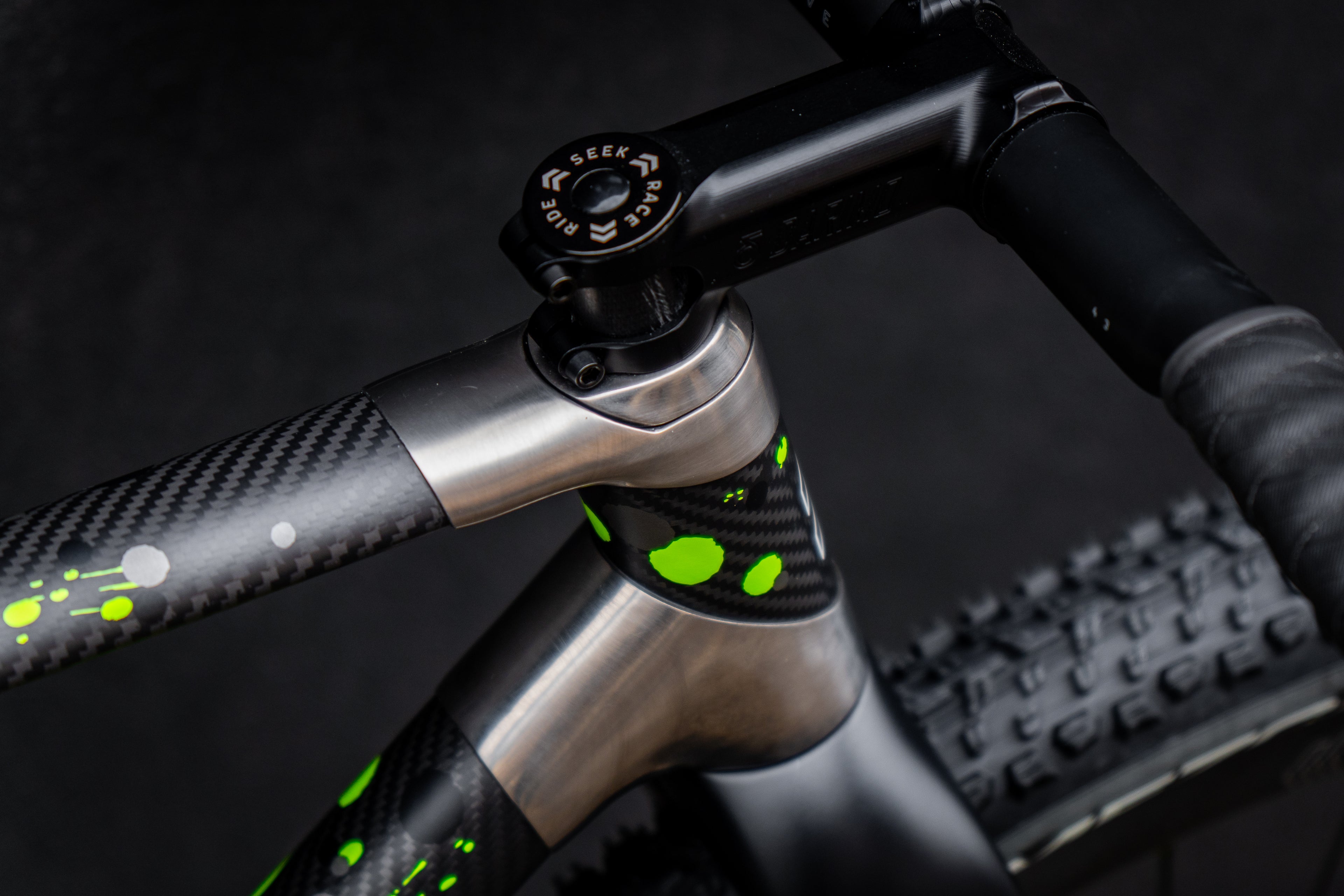 - Internal Routing Integration: CarboKev uses full internal cable routing through prototype versions of our Race 415 carbon fork and Carbon Walmer bar prototype, designed with internal routing in mind. The fork steerer is reinforced with a custom 3D printed titanium sleeve, enabling internal routing without requiring an oversized upper bearing. This system has been lab-tested and validated for structural integrity under high load and impact scenarios.