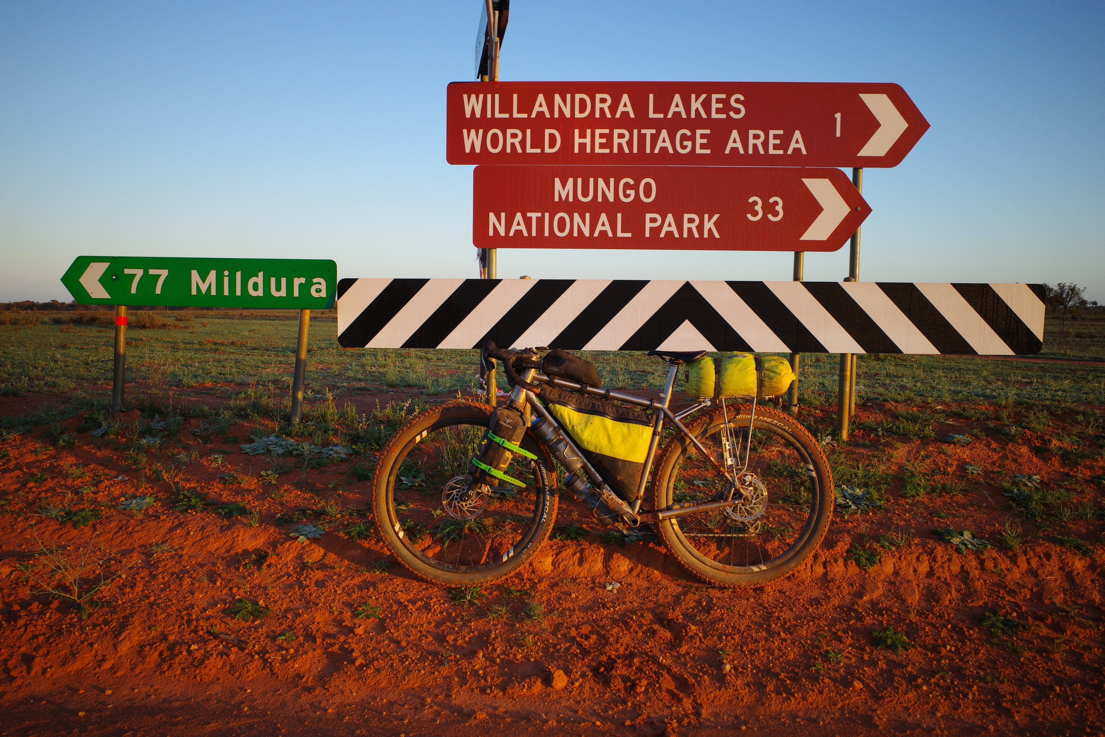 I left Mungo before dawn and enjoyed the sunrise through the scrub, spotting multiple parrot species as I rode toward Mildura. I was surprised at how unsettled I felt by the return to civilization and bustling traffic. This was soon quelled by a typically wonderful regional bakery feed of a huge salad roll, soft drink and apple slice. I stashed more bakery goods in my orange vest and headed off for more supplies from the servo. The route soon directed me off tarmac and along trails splitting Lake Ranfurly and then a delightful single track beside the Murray River. There was some thick clay mud through here. However, I was pleasantly surprised to roll onto the Old Mail Road to find it largely fast rolling. I was luckier than the guys the day before me and still made reasonable progress despite the muckiness of the second half.