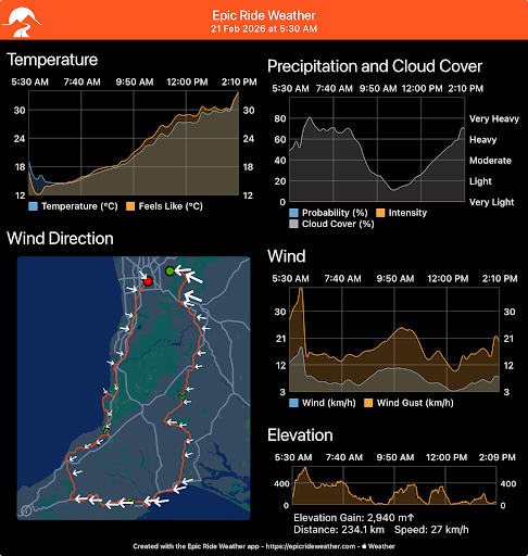 Lastly once the route is done, I like to import it into another favourite app of mine EpicRideWeather (available for iOS and Android and requires a subscription). It connects to all the popular platforms to import routes, and once you enter a start time and expected average speed, it models the weather forecast across the ride including wind strength and direction. As we all know the weather can change dramatically across a ride, especially when routes include mountain ranges and coastal areas. Over the many years of using the app it has been reliably accurate!